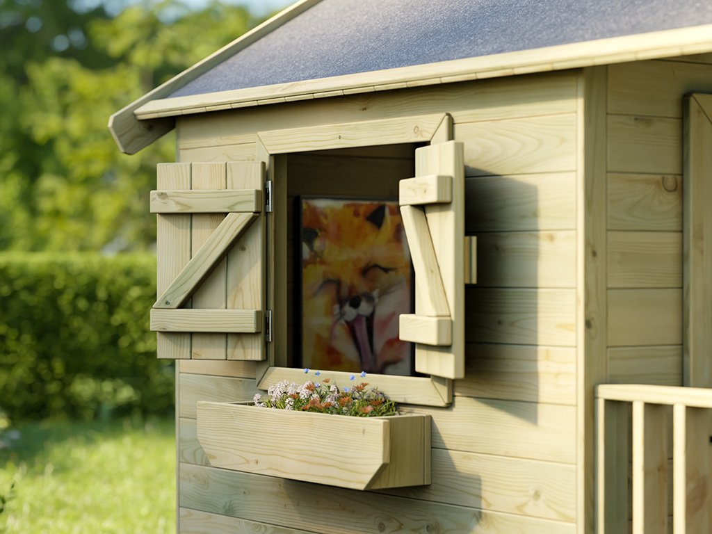 Die zweigeteilte Einzeltür und die drei Fenster bringen viel Licht ins Innere dieses schöne Kinderspielhauses. Das Fenster in der Front ist mit einem Kunstglaseinsatz ausgestattet. Die zwei Fenster in den Seitenwänden werden inklusive Blumenkästen und Fensterläden geliefert und lassen sich damit verschließen. Sowohl Fenster als auch die Holztür sind mit einem Fingerklemmschutz (Spalt zwischen Fenster/Tür und Hauswand) ausgestattet. - Inkl. Fußboden und viel Platz
