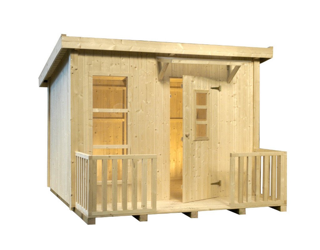Das Spielhaus mit 16 mm starken Wänden wird inklusive einer kleinen Terrasse mit Brüstung geliefert